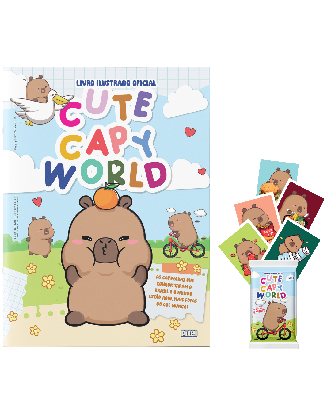 01 Álbum Oficial Cute Capy World, com imagens exclusivas e locais numerados para colar os cromos autoadesivos.