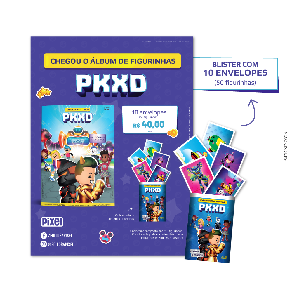 Kit com 50 figurinhas do Livro ilustrado oficial PK XD, sendo 10 envelopes com 5 figurinhas cada. Não acompanha álbum. Imagens ilustrativas. Figurinhas sortidas nos envelopes.